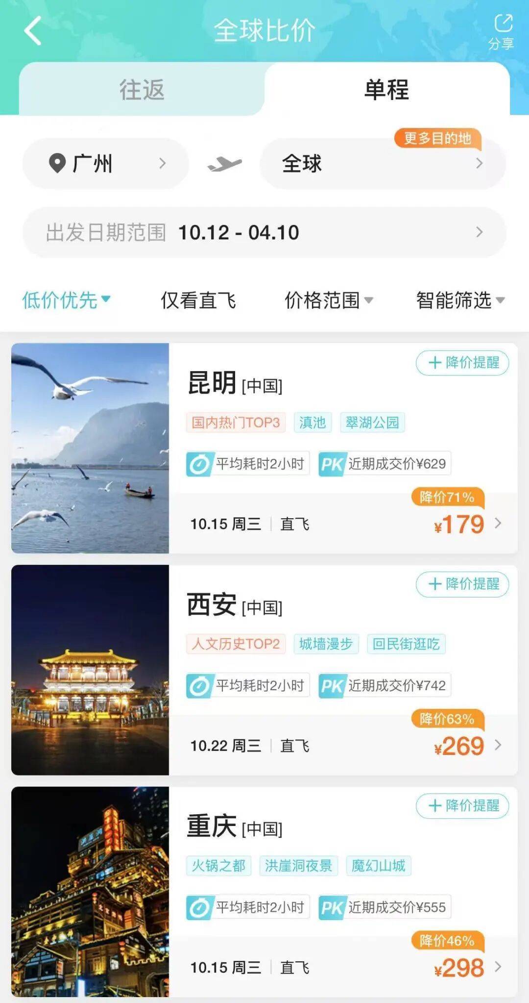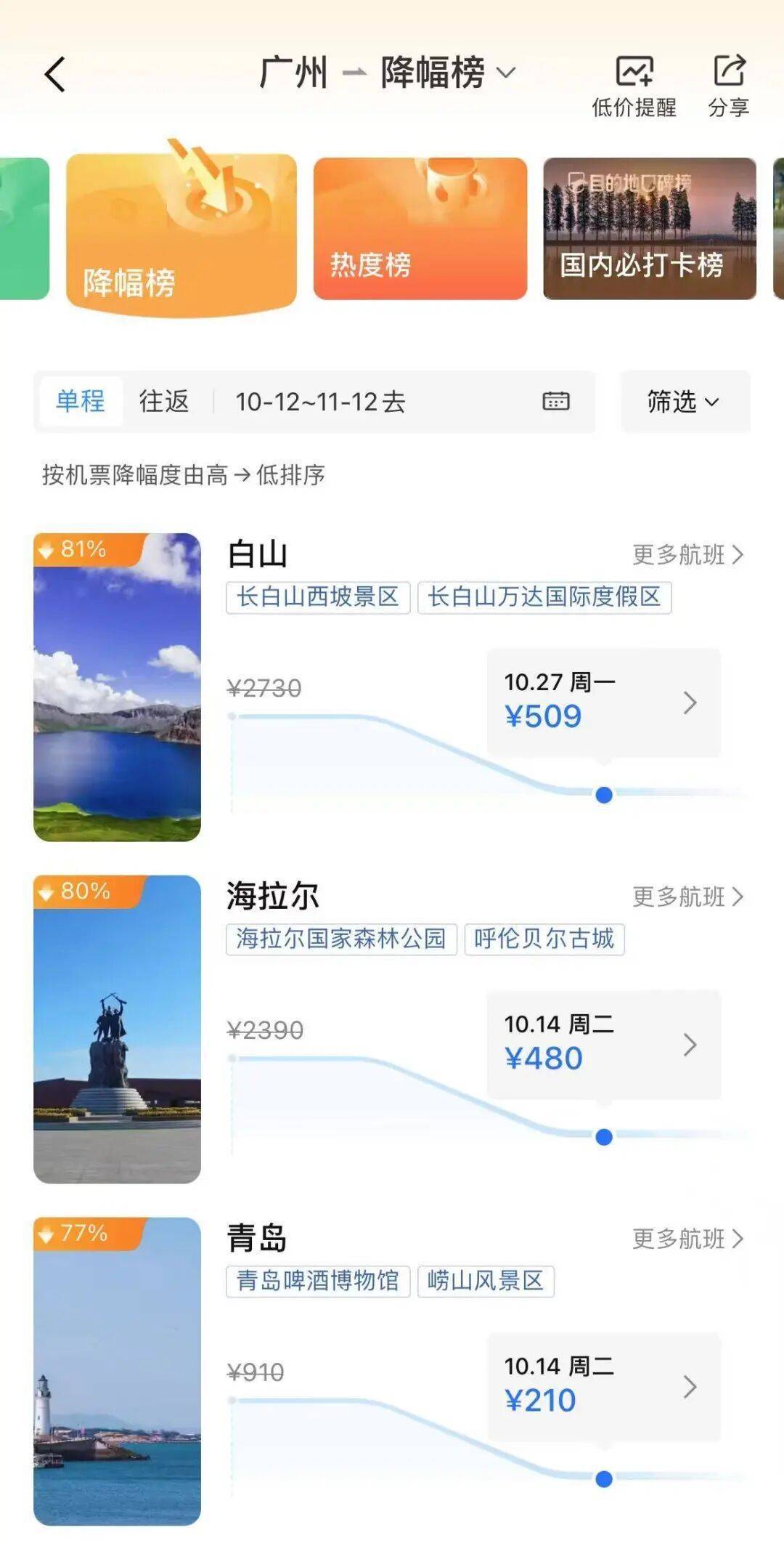 如10月27日,广州飞白山单程价格跌至509元,降幅达81%。