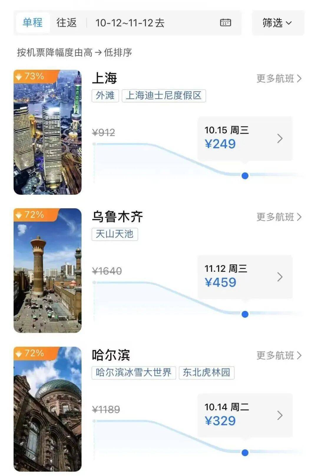 此外,广州飞上海、哈尔滨的机票价格降幅也均达到了70%以上。