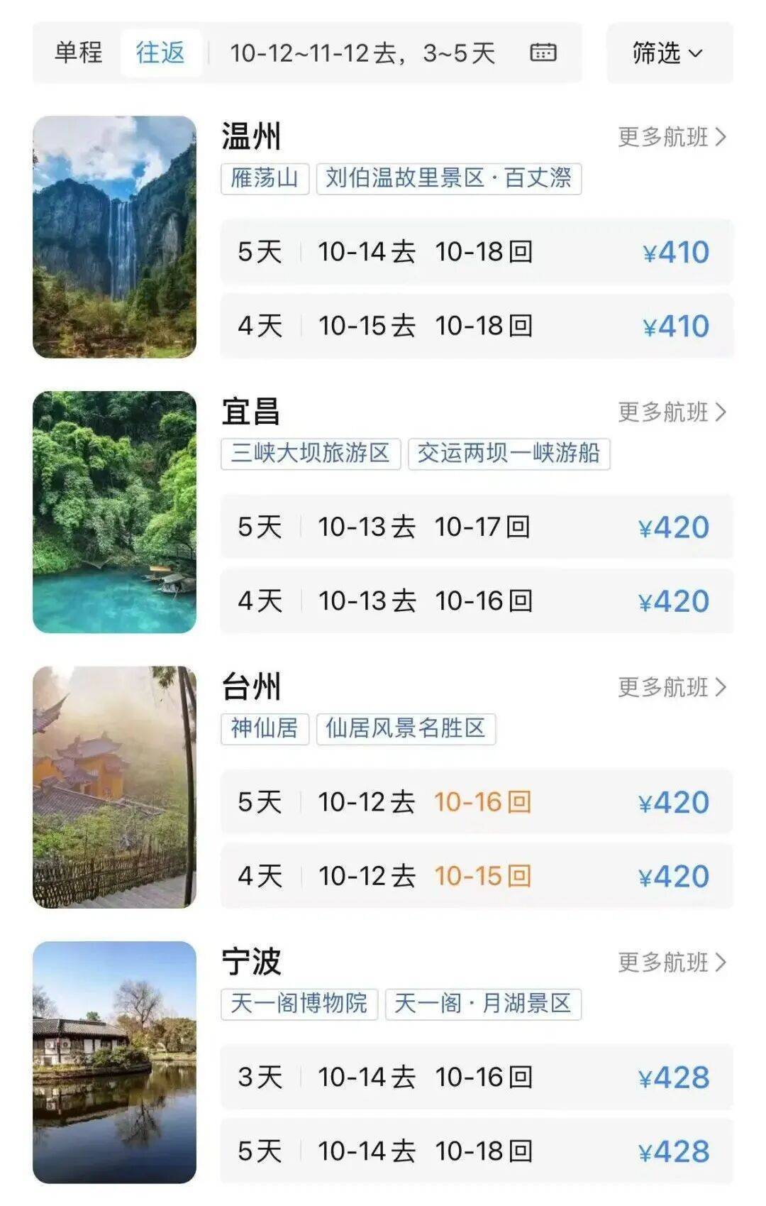 前往温州、宜昌等地往返机票价格仅需400元出头。