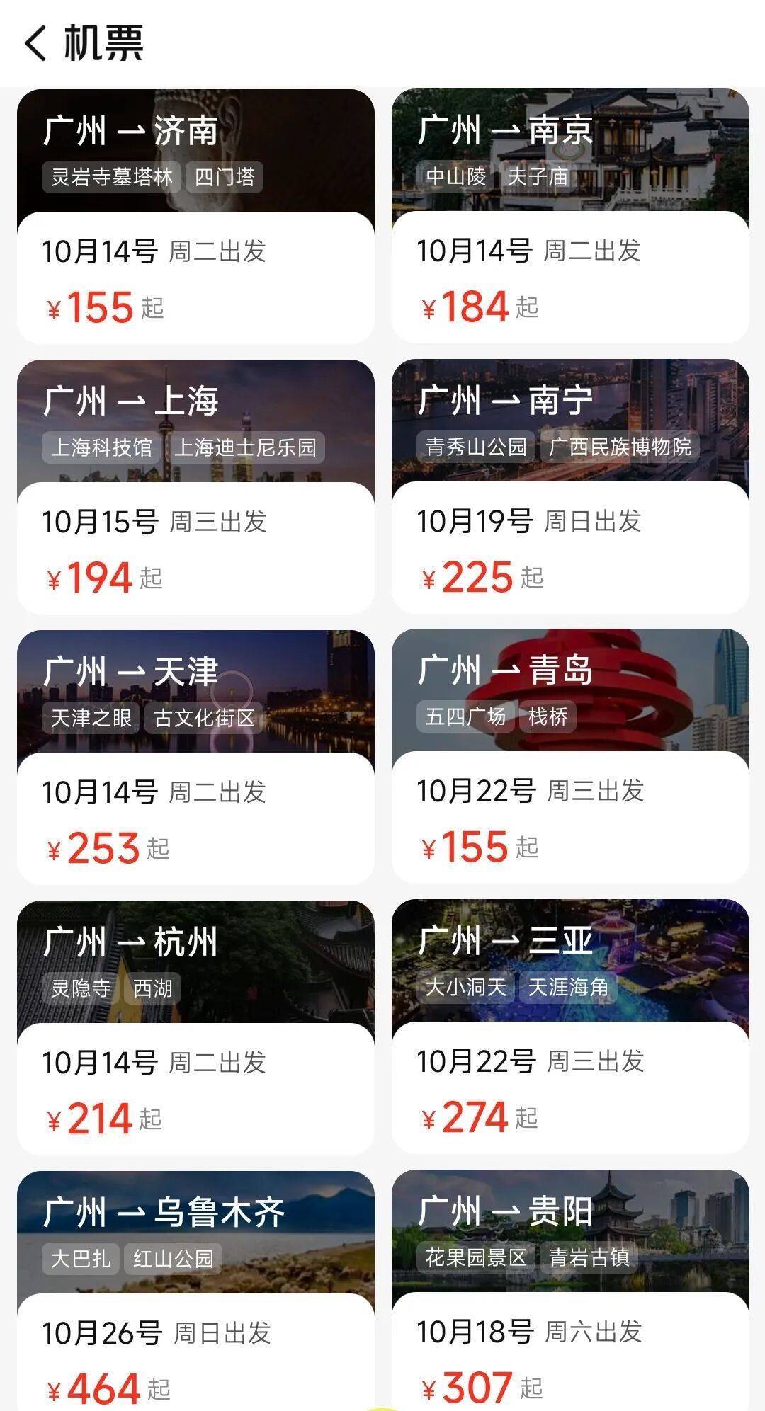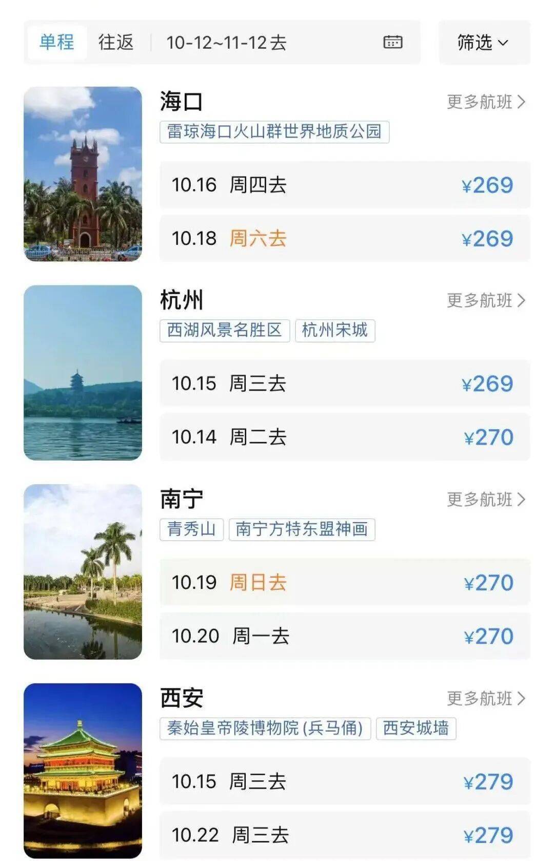 小编查询多个平台发现,节后从广州出发,到济南、南京等热门城市单程机票价格低至百元(机票价格实时浮动牛领策略,具体以平台实际价格为准)。
