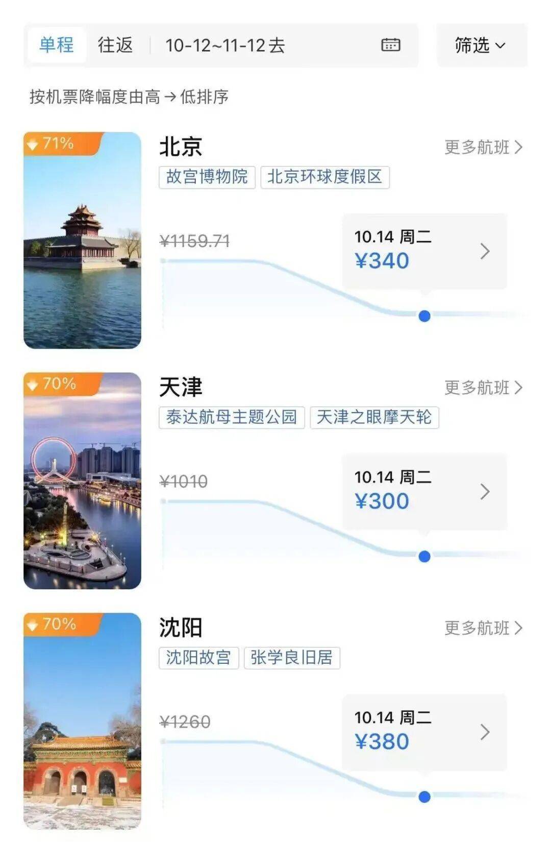 广州飞北京、天津、沈阳等地票价降幅也达到了70%以上。