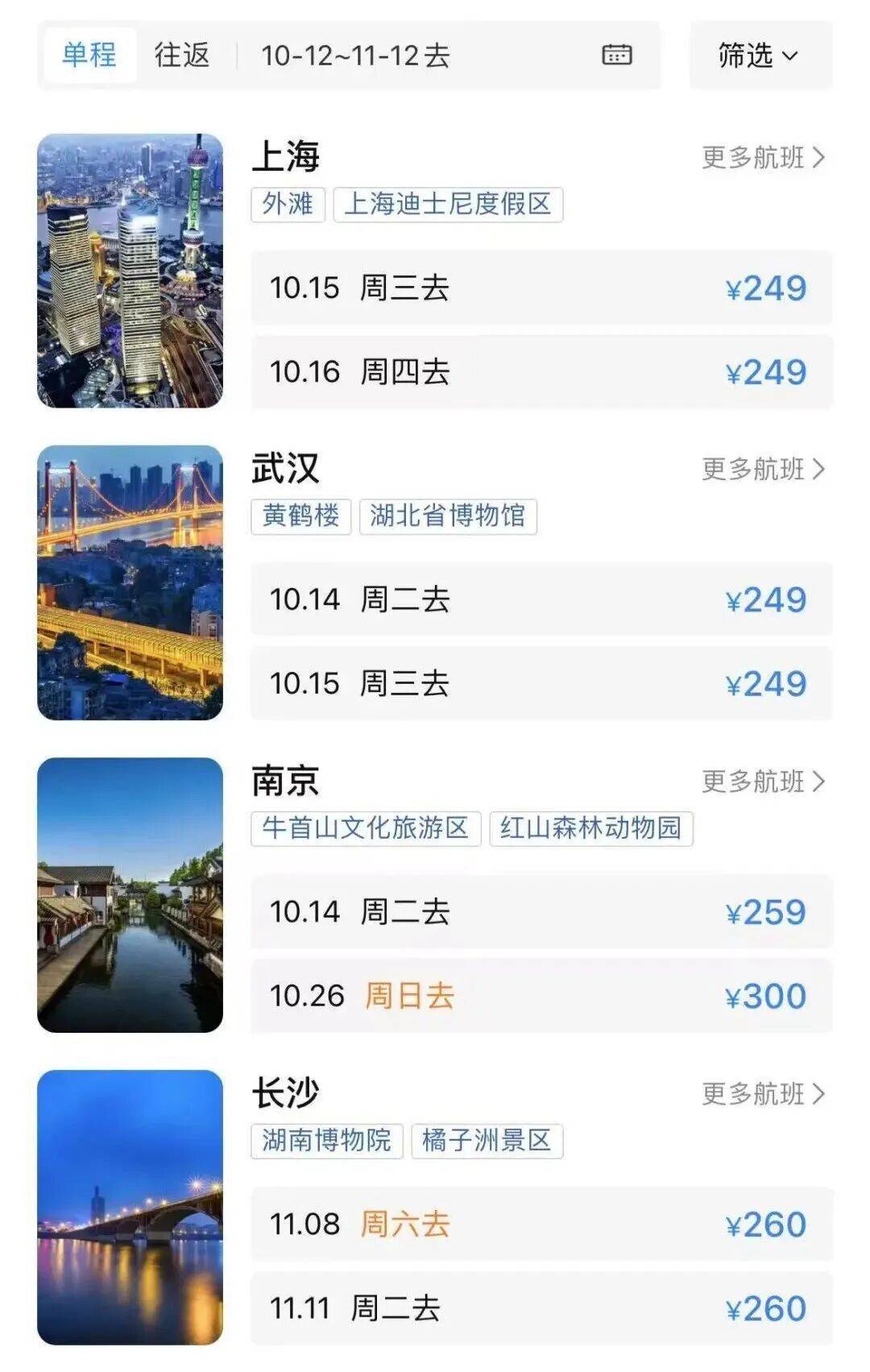 前往上海、武汉、长沙等地,单程机票价格最低两百余元。