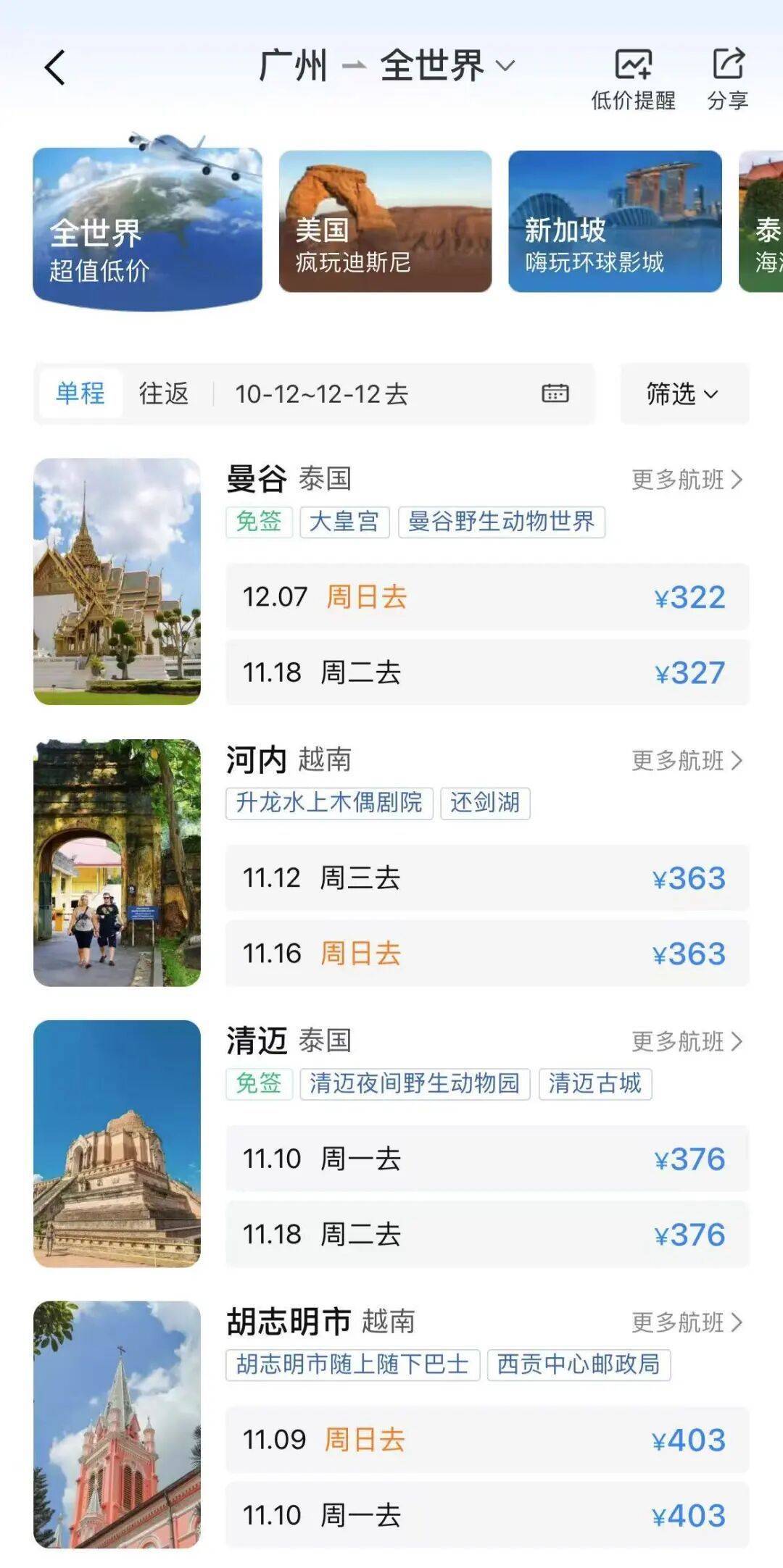 出境游方面,机票也出现了不同程度的降价,广州出发前往曼谷、河内、清迈、胡志明市等旅游地区的最低票价都在400元上下。