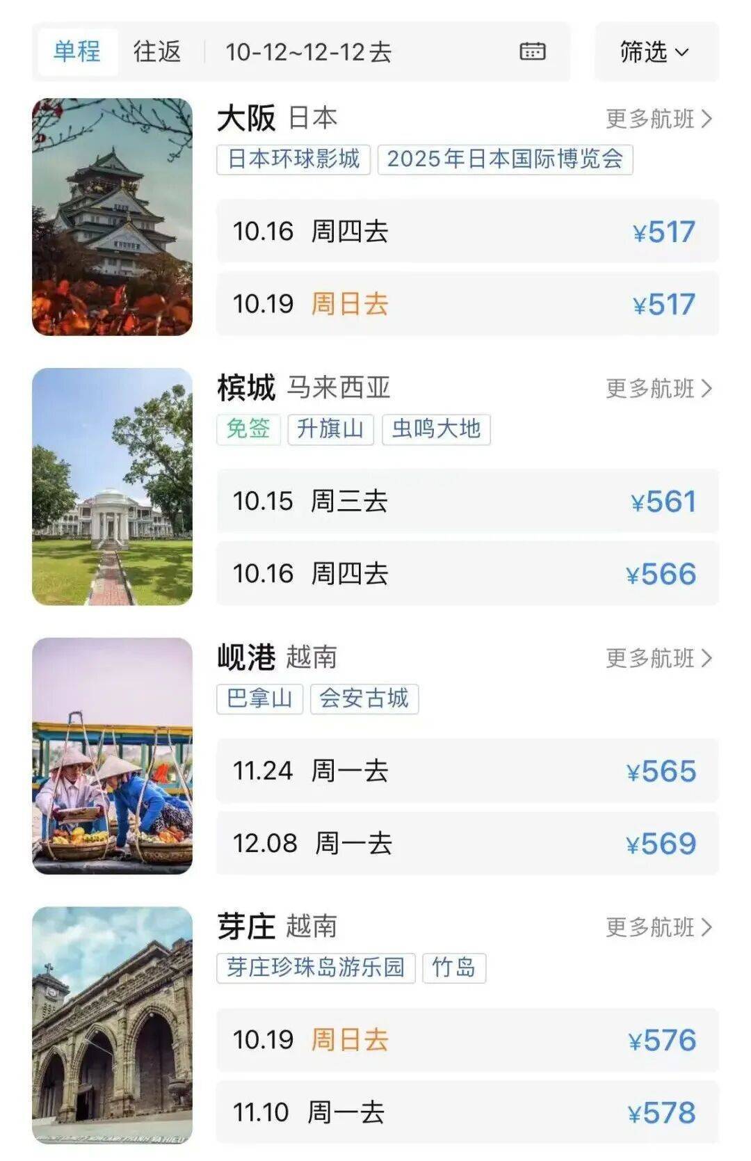 广州出发前往大阪、槟城等地的最低票价在500元左右。